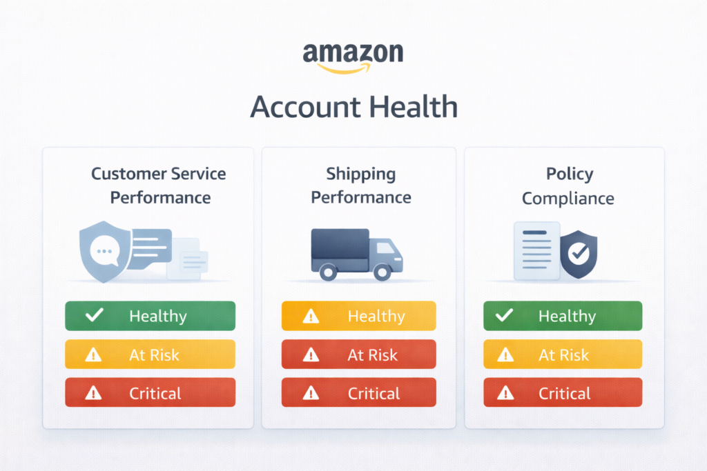 Your Account Health page shows your current standing with Amazon. At the top, you’ll see your overall account status: Good Standing, At Risk, or Critical. Below that, you’ll find detailed metrics broken down into categories.