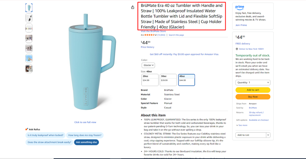 The Problem: While these phrases may sound appealing, they don’t align with how shoppers search on Amazon. Customers are far more likely to type specific queries like “40 oz insulated tumbler with handle,” “leakproof tumbler with straw,” “cup holder friendly travel tumbler,” or “stainless steel water tumbler 40oz.”