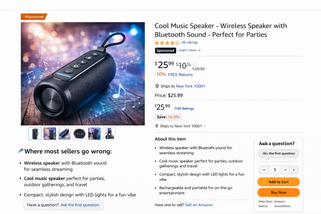 Problem: While some of these might seem relevant, the seller hasn’t validated if these terms have high search volume or buyer intent. For instance, “cool music speaker” may not be a common search term compared to “portable bluetooth speaker”.