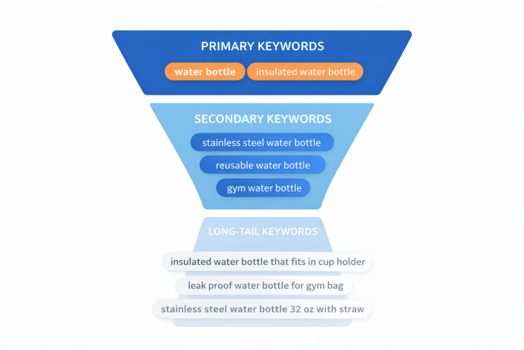 For example, if you sell insulated water bottles, your primary keyword might be “water bottle” or “insulated water bottle.” This keyword should appear in your title, preferably near the beginning. Primary keywords face the most competition but also drive the most traffic when you rank for them.