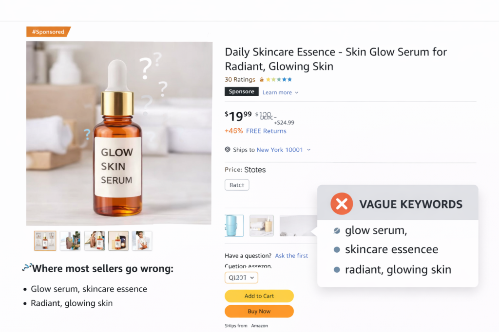 Now compare that to a listing that only uses vague language such as “skin glow serum” or “daily skincare essence.” Even if the product actually contains vitamin C and targets dark spots, Amazon’s algorithm has less confidence that it solves the shopper’s problem because the keywords don’t directly reflect the search.
