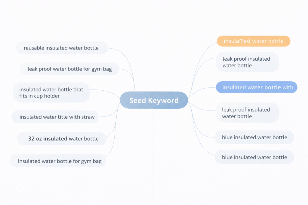 Seed keywords are the broad foundation terms that closely relate to your product’s main category or function. They serve as starting points for discovering more specific, profitable keywords that will actually drive sales.