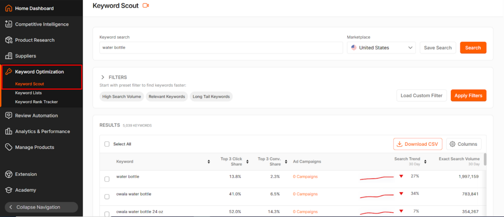 - Poor conversion: Wrong keywords attract wrong customers. Someone searching for “glass water bottle” won’t buy your plastic one, no matter how good your listing is.