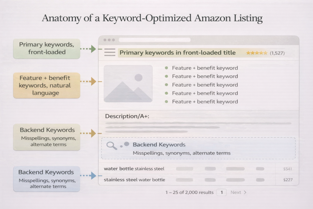 Frontend keywords are visible in your title, bullets, description, and A+ content, so they must read naturally for shoppers. Backend keywords are hidden in Seller Central and are best used for synonyms, misspellings, and alternate phrasing you don’t want in your copy.