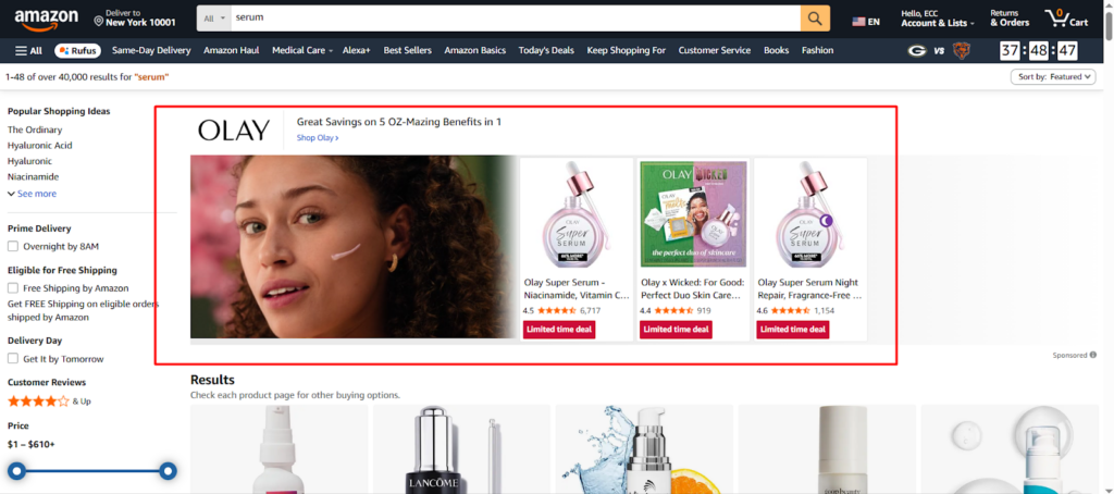 1. Sponsored Brands: Sponsored Brands campaigns put your logo at the top of search results and can drive traffic to your Storefront. This builds brand recognition even when shoppers don’t click immediately.