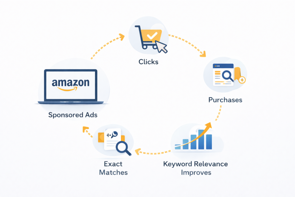 The loop works like this: Your ad shows for “wireless running earbuds” → Customer clicks and buys → Amazon registers that sale for that specific keyword → Your keyword relevance strengthens → Your organic ranking improves → You start getting organic sales → Those organic sales further boost ranking.