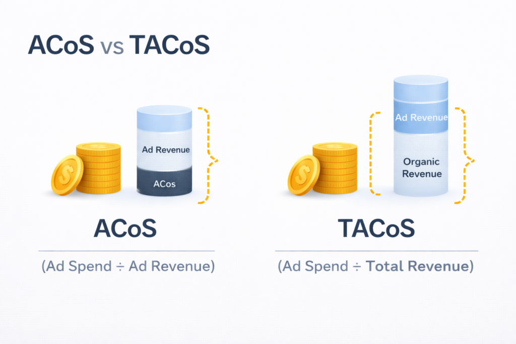 ACoS measures ad spend vs ad sales only, while TACoS includes organic sales too. TACoS shows whether ads are building organic momentum or just buying sales.