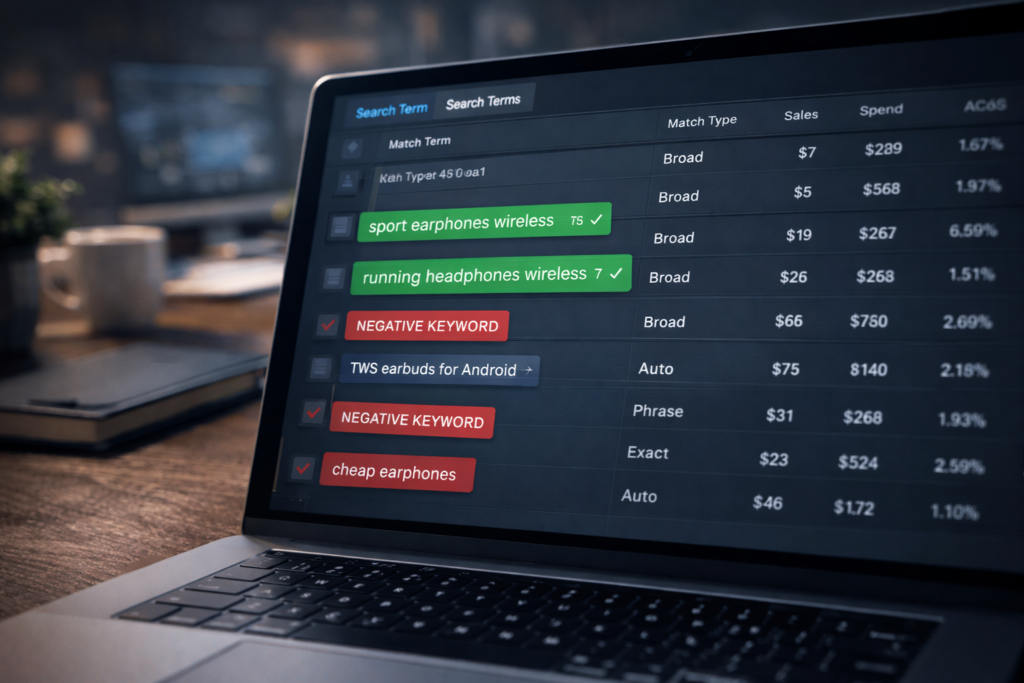 2. Broad Match Manual Campaigns: Create one Broad Match campaign with 5-12 tightly relevant seed keywords—not 30 or 50. A focused list of terms that directly describe your product generates cleaner data than a sprawling list where you can’t tell what’s actually working. For wireless running earbuds, your broad campaign might target: