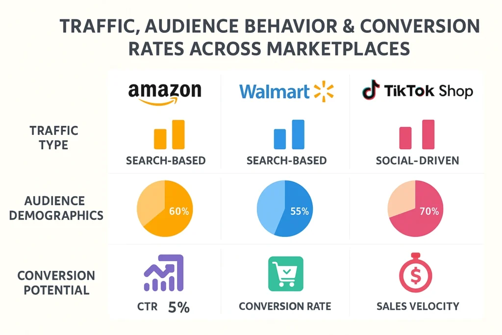 Align your campaigns with platform strengths—use Amazon’s search-driven ads for high-intent buyers, Walmart’s promotions for loyal shoppers, and TikTok’s social/viral content to maximize ROI.