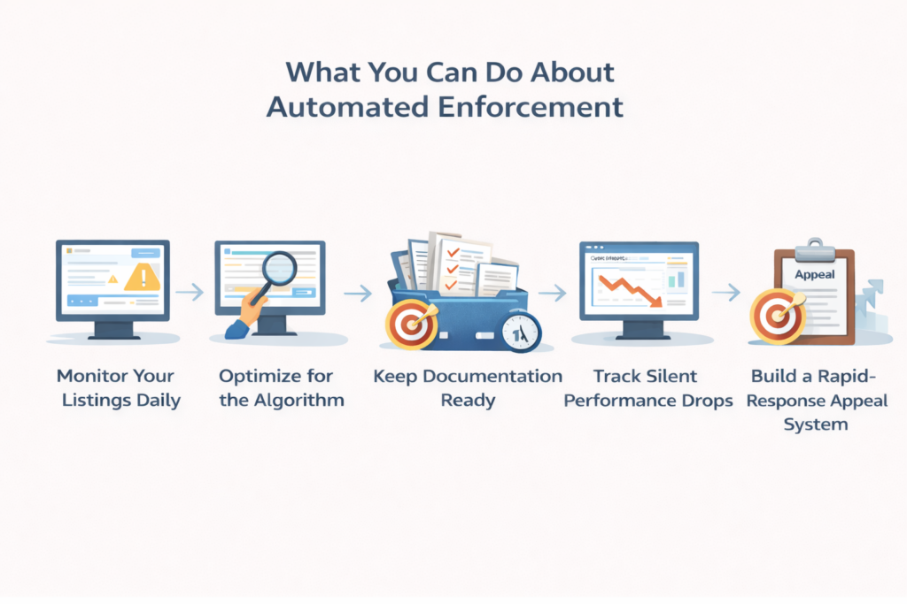 Automated enforcement systems detect policy violations, authenticity concerns, or compliance issues and suppress listings immediately. Common triggers include prohibited claims in titles, image guideline violations, rapid price changes, or documentation gaps that raise red flags.