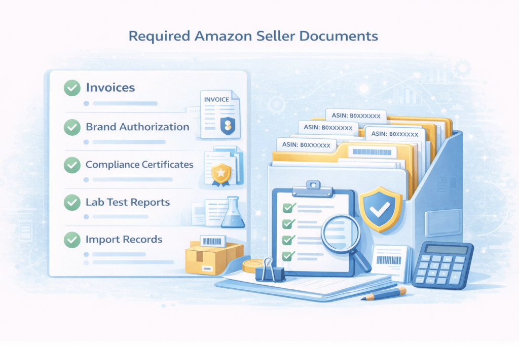 At minimum: supplier invoices (last 12 months), brand authorization letters, business licenses, proof of authenticity documentation, shipping and import records, and product safety certifications. Keep these organized and accessible with less than one hour retrieval time.
