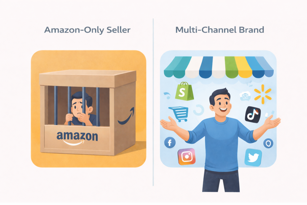 The Competitive Disadvantage: Your most successful competitors aren’t Amazon-only anymore. They’re building brands across Shopify, Walmart, TikTok Shop, and their own websites—capturing customer data, building email lists, and creating multiple revenue streams while you depend entirely on one platform.
