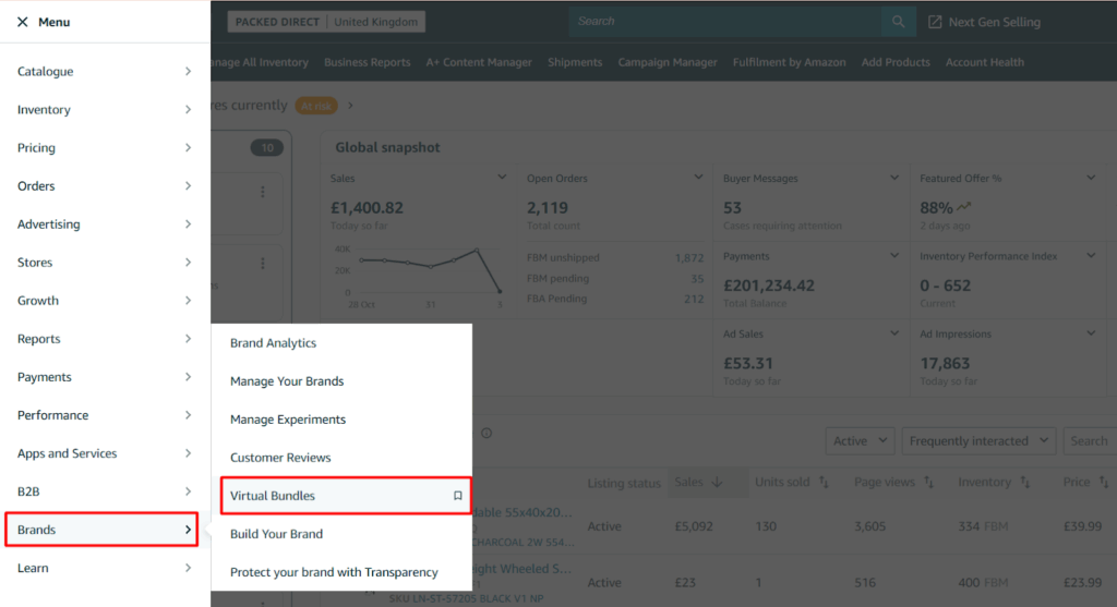 - Go to “Virtual Bundles” in Seller Central: Log in to Seller Central, navigate to the Brands tab, and select Virtual Bundles. This tool is available only for Fulfilled by Amazon (FBA) products under your registered brand.