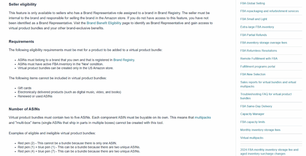 Only sellers enrolled in Amazon Brand Registry can create Virtual Bundles. All included products must be FBA (Fulfilled by Amazon) and belong to the same brand catalog.