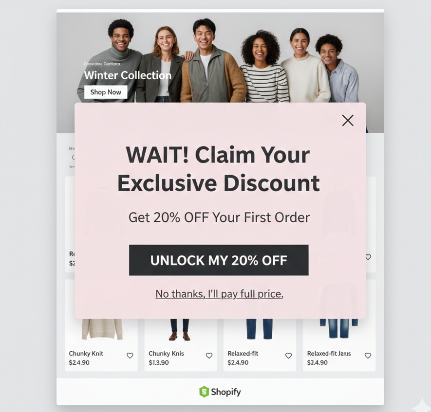 Exit-intent pop-ups are perfect here. They trigger when someone’s about to leave, not when they just arrived and are still figuring out what you sell.