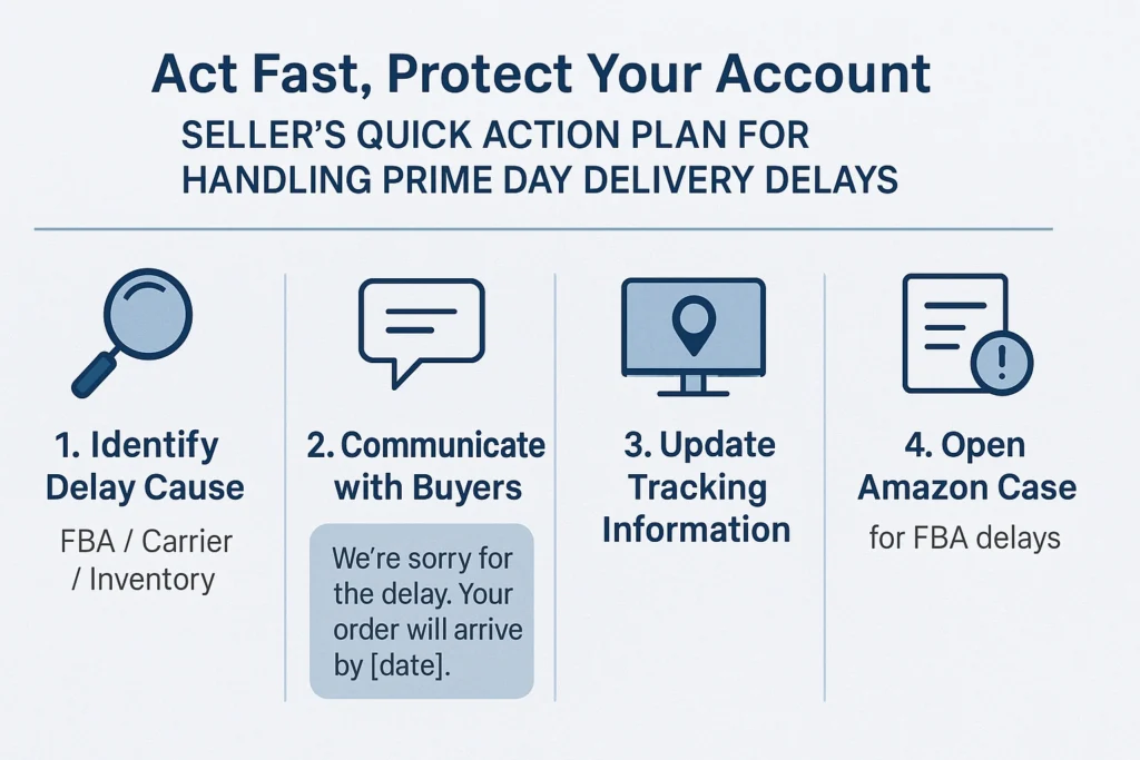 Even the most prepared sellers can face delivery hiccups during Prime Day. Acting quickly can protect your metrics, prevent negative reviews, and keep buyers happy. Here’s an immediate action plan: